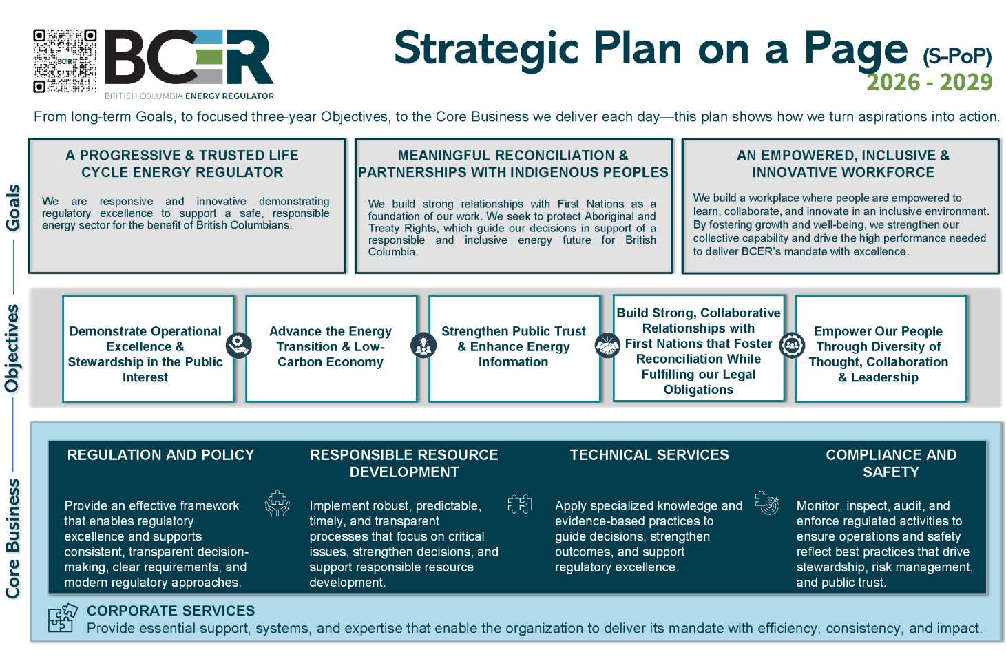 Each year our Board Chair and Directors, and the Minister of Energy and Climate Solutions sign a Mandate Letter setting out government’s overarching priorities and at a high level, the government’s expectations of the BCER. We articulate our corporate strategy through the long-term goals, objectives and core business documented within the Strategic Plan.