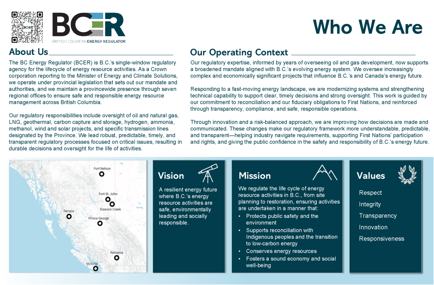 The BC Energy Regulator is self-funded through the application of industry fees and levies. We are accountable to the provincial legislature and the public through the Ministry of Energy and Climate Solutions.