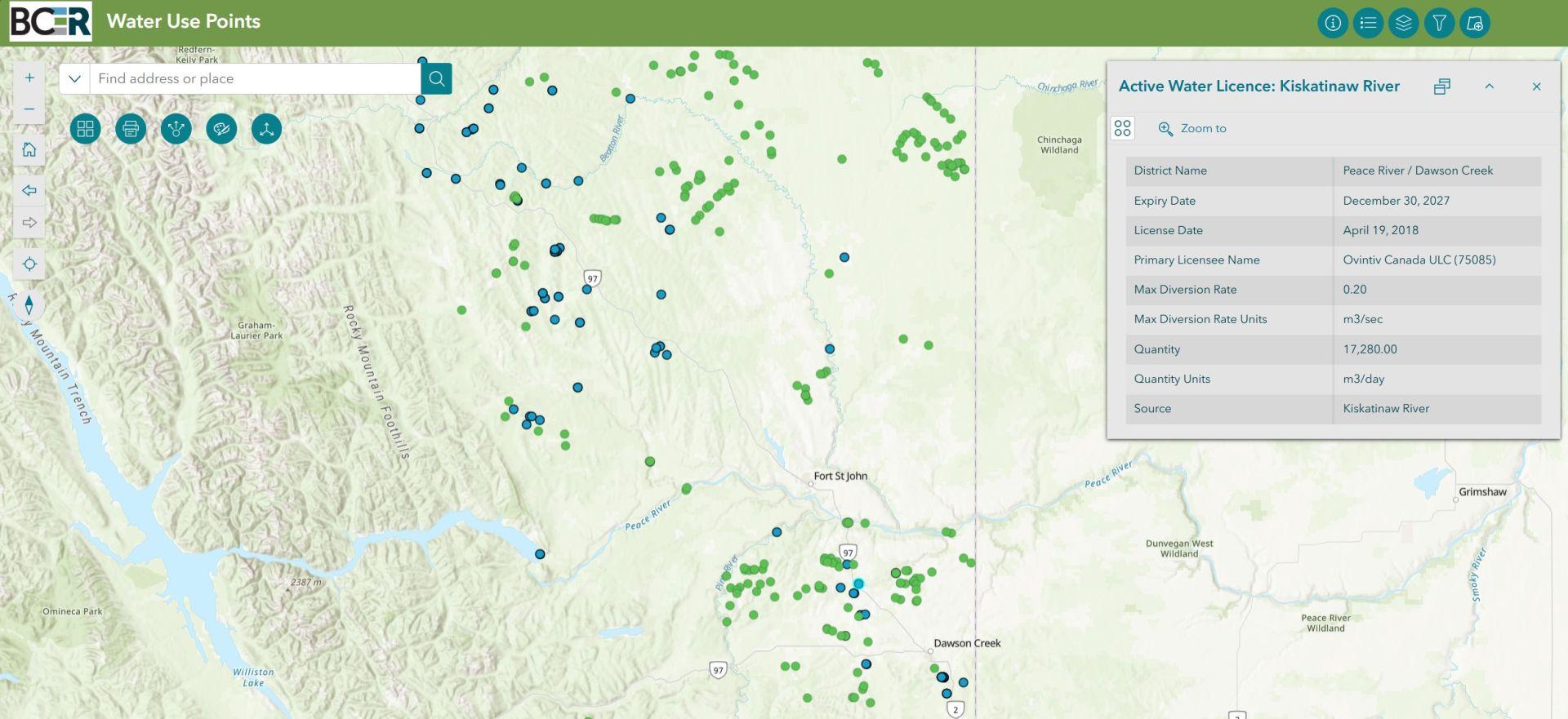 Locations of short-term water use approvals and water rights licences for energy resource activities in B.C.